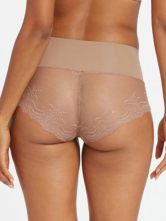 Die Lace-Hi-Hipster Panty aus der „Undie-Tectable“ Serie der Hollywood-Marke SPANX besteht aus einer raffinierten Kombination aus weichem, langlebigem Stretchmaterial und feiner, transparenter Spitze. Der hohe Bund der Panty wirkt leicht modellierend und kaschiert ein kleines Bäuchlein, während die weichen Abschlüsse und das flache Design das Höschen unsichtbar unter der Kleidung machen.